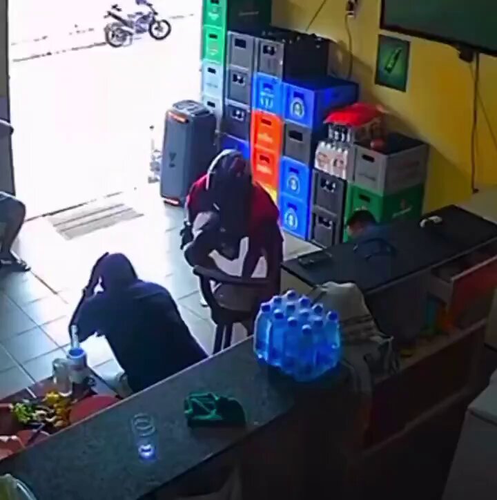 A dramatic incident occurred in a small tropical shop when an armed robbery was interrupted by a courageous customer. Surveillance footage shared widely on social media captures the moment a helmeted gunman on a motorcycle demanded cash from seated patrons. The robber, dressed casually in flip-flops, seemed overly confident.