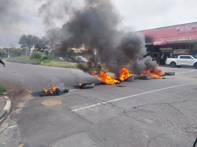 Yusuf Abramjee’s post on Twitter captures a spontaneous service delivery protest in Jeppestown, Johannesburg, where residents burned tires to block roads after four days without power, as shown in the attached photo of smoke-filled streets and barricades.