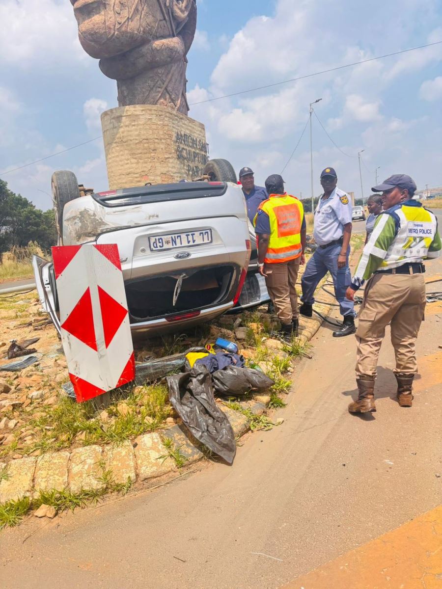 They approached the victim, who jumped out safely, and pursued the suspect vehicle. The suspect lost control and collided with a sculpture. With SAPS assistance, one suspect was apprehended while trying to flee the other lost his life.