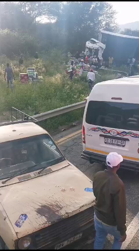 An X post by anti-crime activist Yusuf Abramjee shares a video from Harding Road in Port Shepstone, KwaZulu-Natal, showing a large truck that overturned with its cargo of boxed fruit and juice spilled across the roadside.