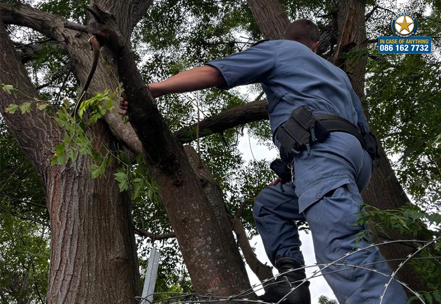 Marshall Security Armed Response Officers, together with Special Operations Team members, and supported by Greenwood Park SAPS and the Metro Police K9 Unit, quickly surrounded the area. Teams then worked to bring the suspect down safely, with members physically climbing the tree to reach him.