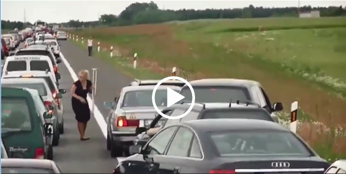 In a recent incident captured on video, a woman in a black dress was seen exiting her car during a traffic jam on the highway. Her actions were aimed at blocking vehicles from using the emergency shoulder as an alternate lane, a move that has drawn attention to the ongoing tensions between road safety regulations and the urgency experienced by drivers stuck in traffic.